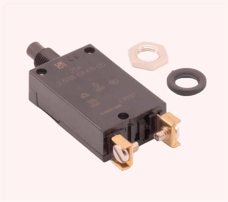Circuit Breaker; 25 A; 250 VAC/28 VDC; 3000; 100 Megohms (Min.); 0.35 in.