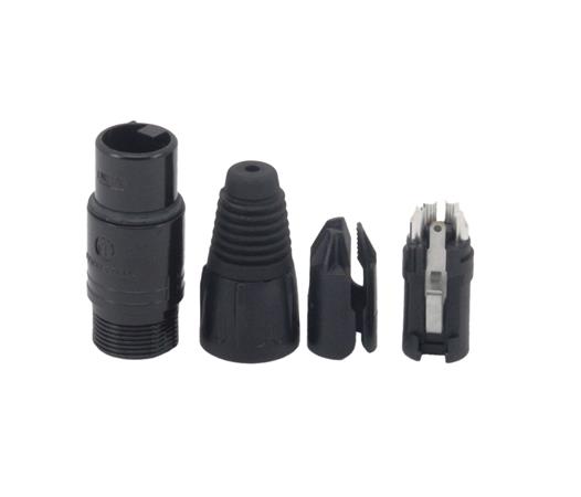 X Series - 4 pole female cable connector with black metal housing and silver contacts.