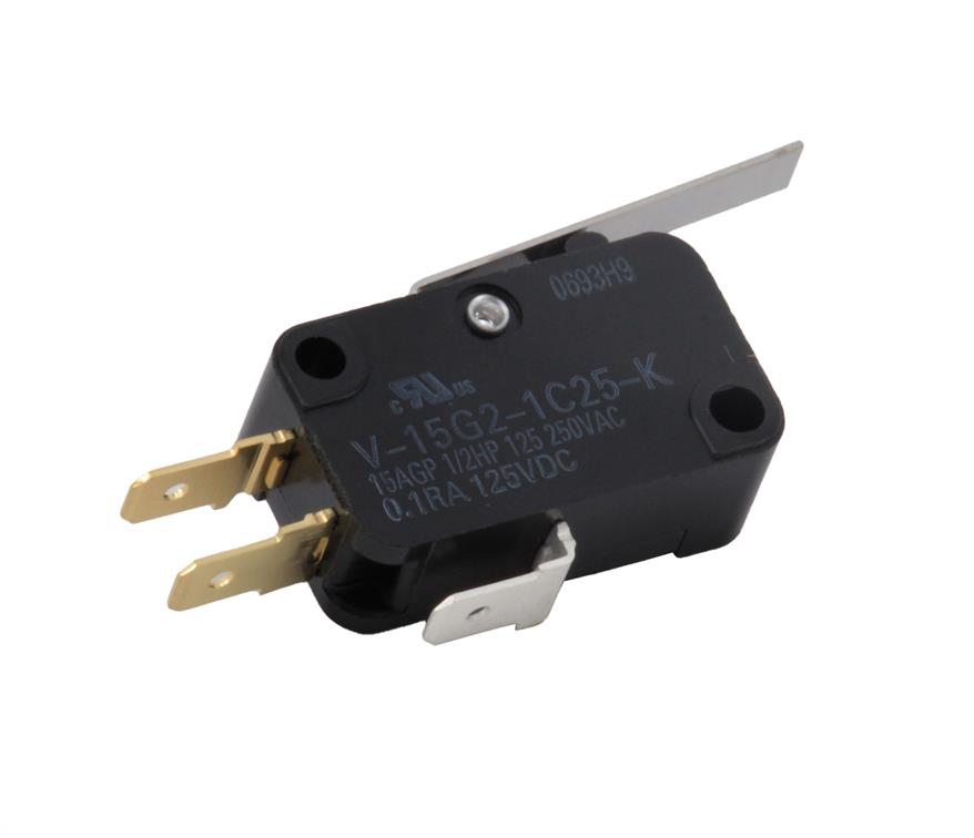 The V-15G5-1C25-K is a single-pole double-throw (SPDT) general purpose Snap Action Switch with quick-connect terminals (#187), a short hinge roller lever actuator and 0.5mm (G gap) contact gap. It is widely used for applications where long life expectancy and high reliability is required.