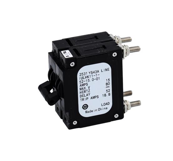 The IELHK11-1-52-50.0-01-V is a two-pole hydraulic magnetic circuit protector designed for reliable circuit protection and power switching. This protector features a series-trip configuration with a 50.0A current rating and a long delay curve (delay 52) specifically for DC circuits. It is equipped with stud terminals for secure connections and a black toggle handle per pole, marked 'ON-OFF' for clear status indication. The device is trip-free, ensuring it will trip on an overload even if the handle is forcibly held in the ON position. With VDE, CCC, UL, and CSA approvals, it is suitable for equipment in the international marketplace requiring robust and accurate overcurrent protection.