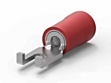 The 324608 from TE Connectivity / AMP Brand is insulated (red color), tin plated spade flange tongue terminal for wire range from 22 to 16 AWG. This flanged spade tongue terminal has 2 stud size, 0.182" (4.62mm) outer edges width and closed barrel.