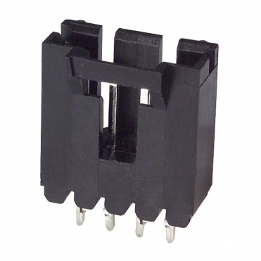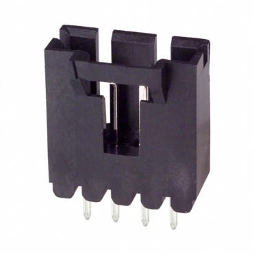 A 4-position, single-row, right-angle shrouded latching header with hold-downs and matte t ...