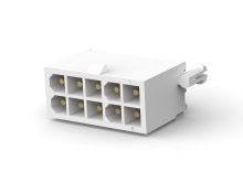 A 10-position, dual-row, vertical PC board pin header from the Mini-Universal MATE-N-LOK c ...